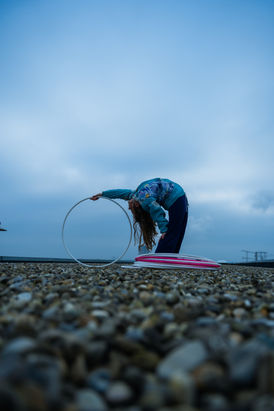 With her main discipline hula hoops she has developed her own style of hooping where she combines object manipulation with dance and movement. Her work explores the deconstruction of feminine-coded aesthetics, questioning how grace, beauty, and delicacy are expected to appear on a female body in circus. She approaches her discipline with irony and provocation, searching for ways to challenge and reframe the gaze of the audience. “My hoop hits like a sledge hammer.”